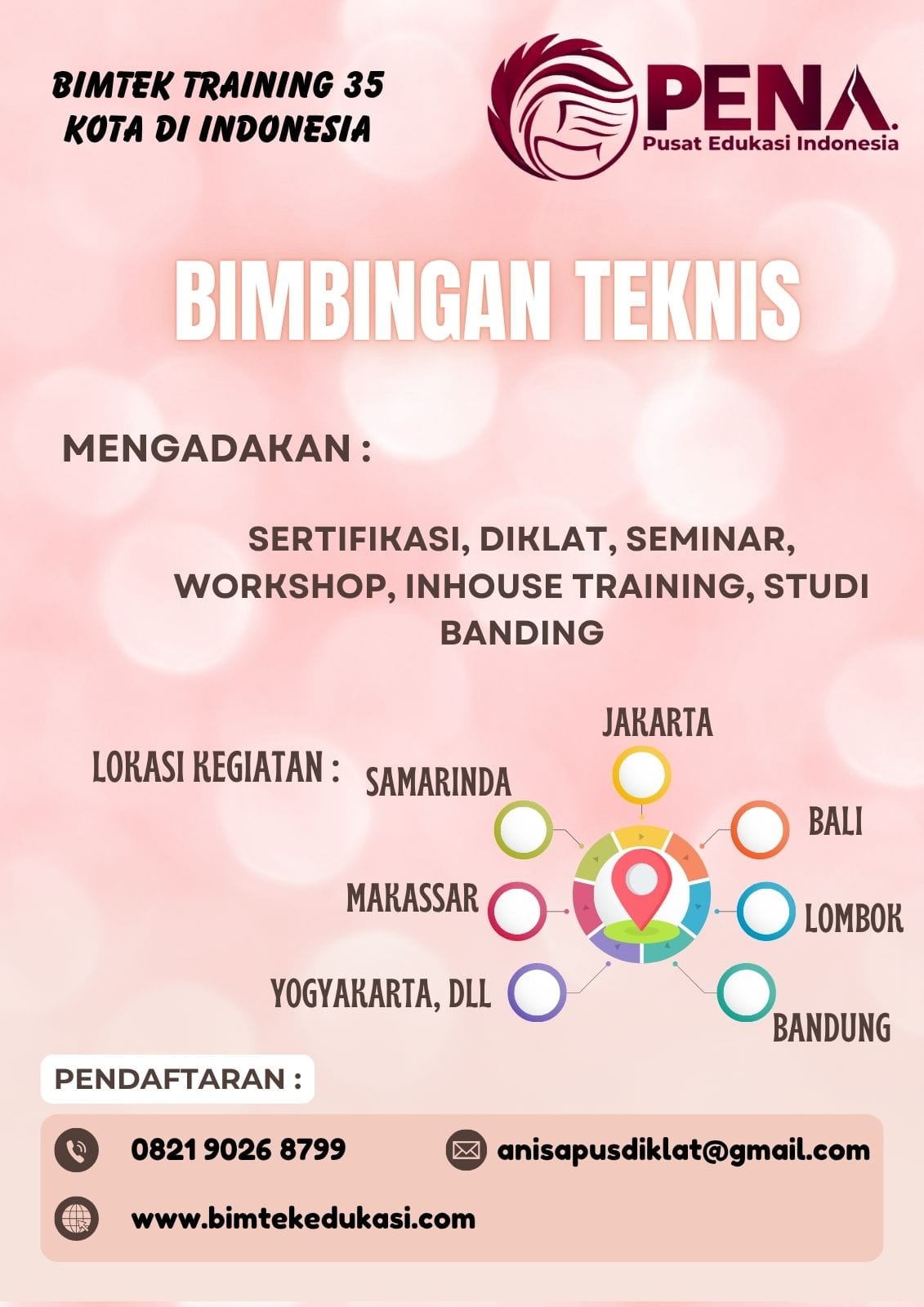 Pusat Edukasi Indonesia menyelenggarakan Kegiatan Bimbingan Teknis dan Pendidikan Pelatihan yang dilaksanakan pada :